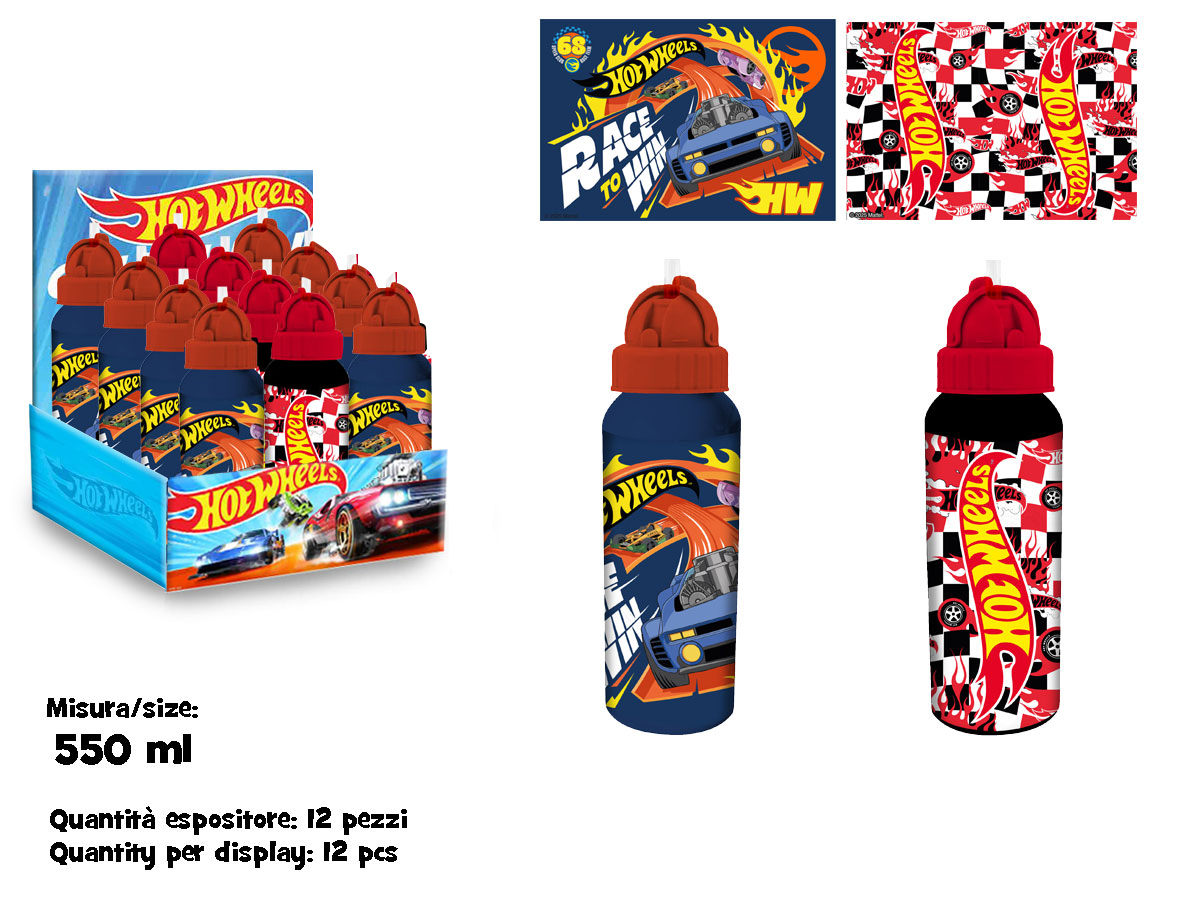 Borraccia alluminio 550 ml Hot Wheels con cannuccia flessibile, leggera e resistente. Senza BPA, con tappo di sicurezza antigoccia, ideale per la scuola e il tempo libero. Licenza ufficiale Hot Wheels garantita.