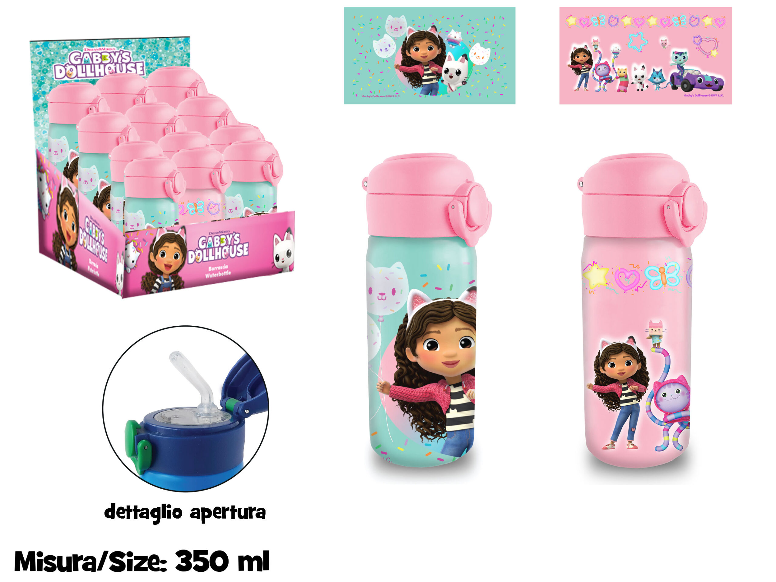 Borraccia termica acciaio inox 350 ml Gabby con cannuccia integrata e tappo ermetico. Doppia parete isolante, senza BPA, mantiene le bevande alla temperatura giusta per ore. Grafica in licenza ufficiale Gabby.