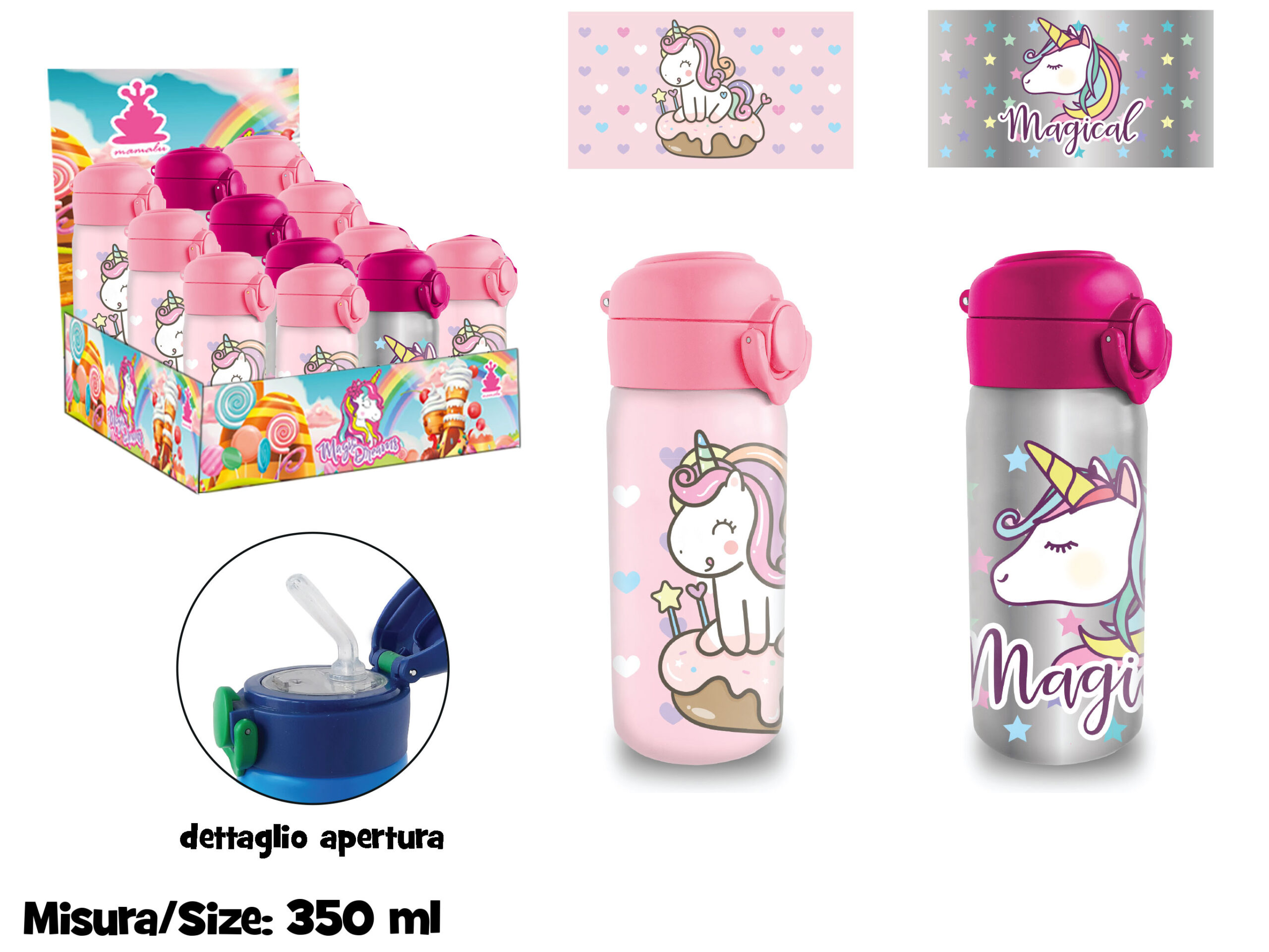 Borraccia termica acciaio inox 350 ml Unicorno con cannuccia integrata e tappo ermetico. Doppia parete isolante, senza BPA, mantiene le bevande alla temperatura giusta per ore. Con licenza ufficiale Unicorno, 100% originale.