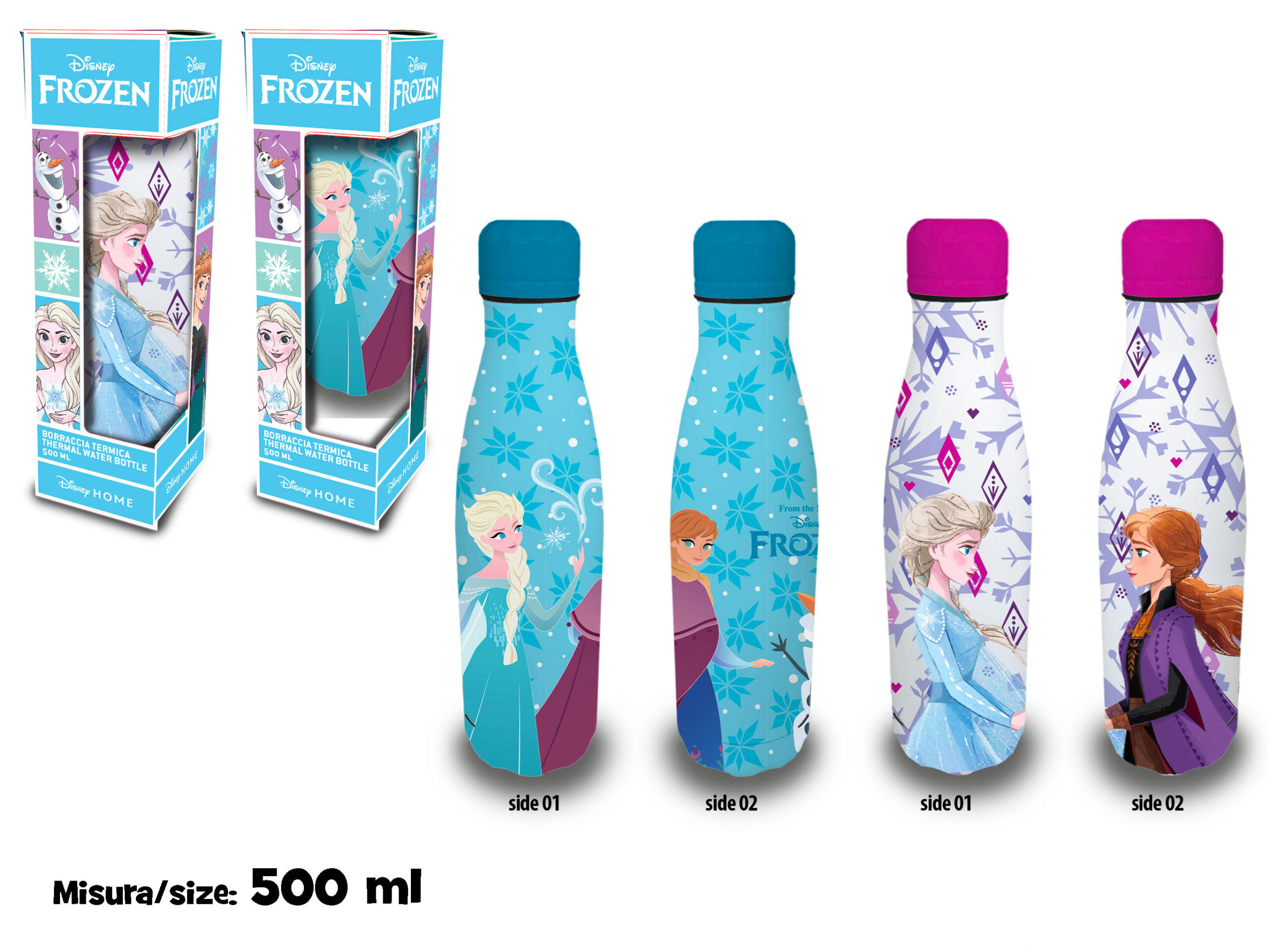 Borraccia termica 500 ml Frozen in acciaio inox con doppia parete isolante. Mantiene le bevande fredde o calde per ore, senza BPA e resistente per l’uso quotidiano. Licenza ufficiale Frozen garantita.