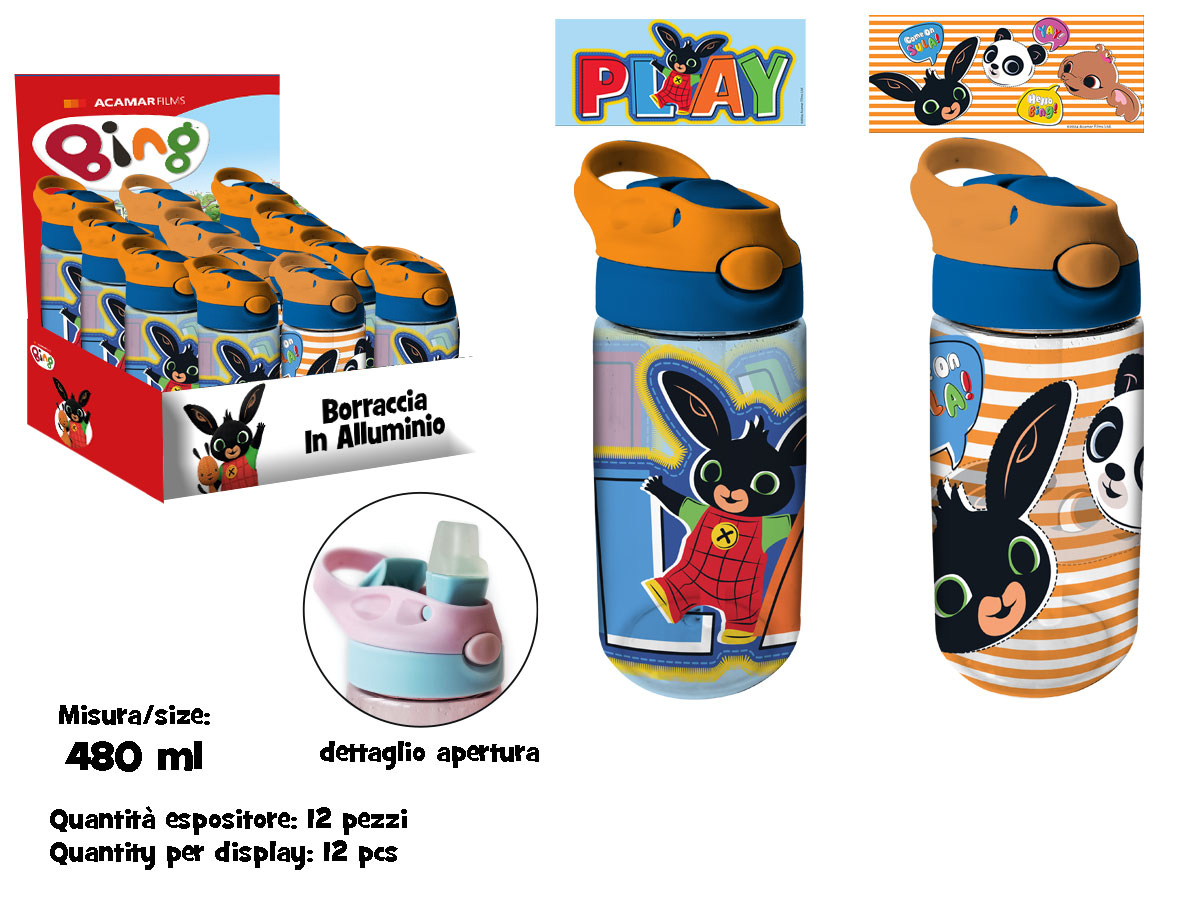 Borraccia trasparente 480 ml Bing in plastica Biobased SK, materiale eco-sostenibile e senza BPA. Con cannuccia morbida, leggera e sicura per i bambini. Prodotto con licenza ufficiale Bing.