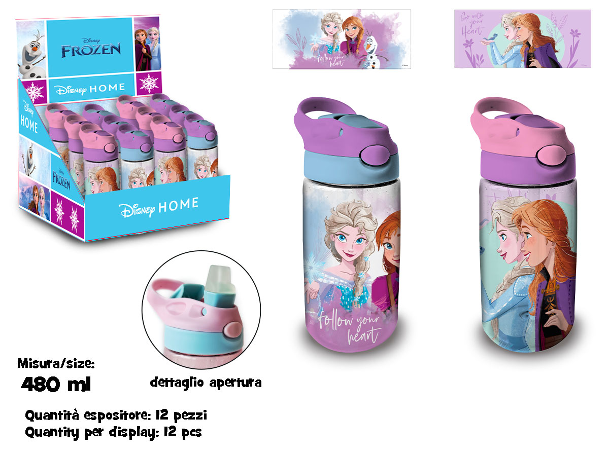Borraccia trasparente 480 ml Frozen in plastica Biobased SK, materiale eco-sostenibile e senza BPA. Con cannuccia morbida, leggera e sicura per i bambini. Grafica in licenza ufficiale Frozen.