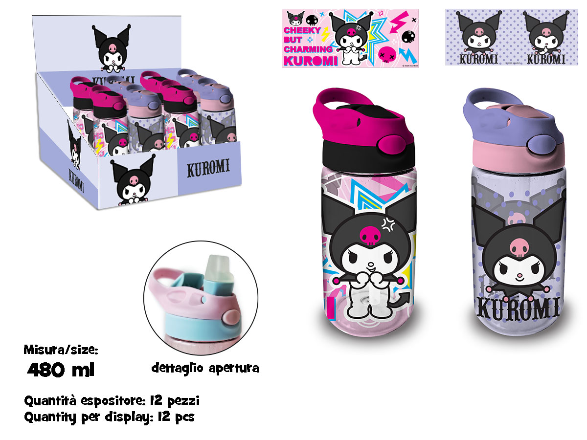 Borraccia trasparente 480 ml Kuromi in plastica Biobased SK, materiale eco-sostenibile e senza BPA. Con cannuccia morbida, leggera e sicura per i bambini. Grafica in licenza ufficiale Kuromi.
