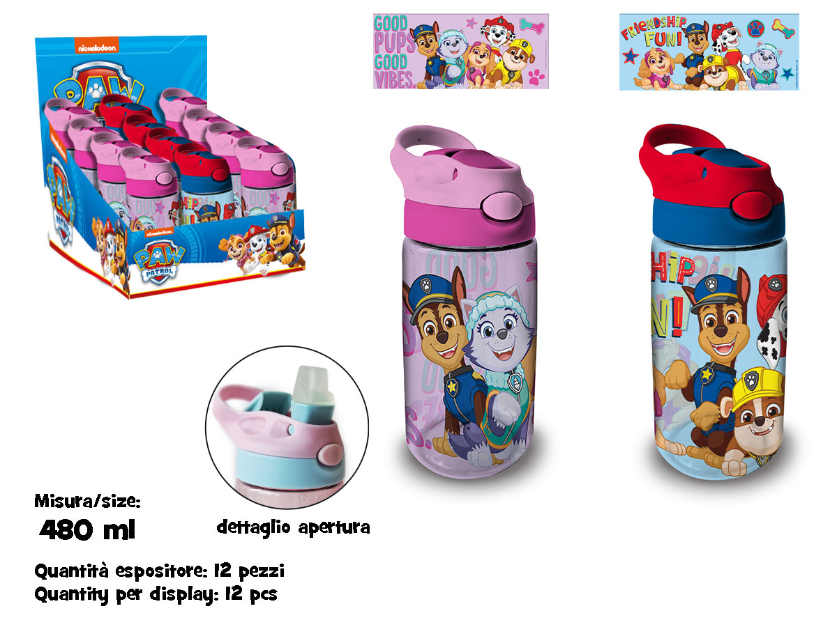 Borraccia trasparente 480 ml Paw Patrol in plastica Biobased SK, materiale eco-sostenibile e senza BPA. Con cannuccia morbida, leggera e sicura per i bambini. Con licenza ufficiale Paw Patrol, 100% originale.