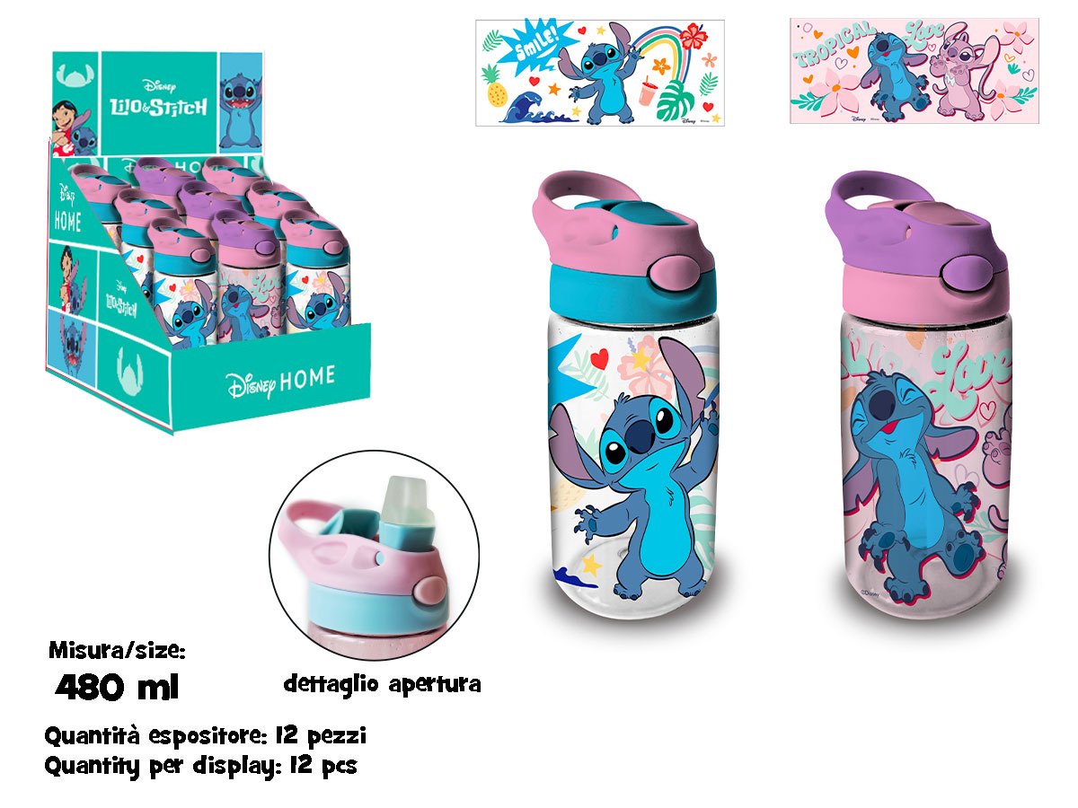 Borraccia trasparente 480 ml Stitch in plastica Biobased SK, materiale eco-sostenibile e senza BPA. Con cannuccia morbida, leggera e sicura per i bambini. Grafica in licenza ufficiale Stitch.