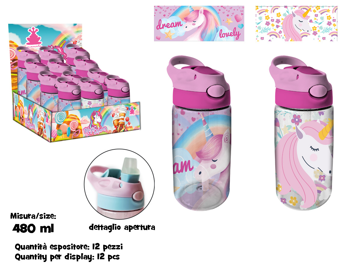 Borraccia trasparente 480 ml Unicorno in plastica Biobased SK, materiale eco-sostenibile e senza BPA. Con cannuccia morbida, leggera e sicura per i bambini. Con licenza ufficiale Unicorno, 100% originale.