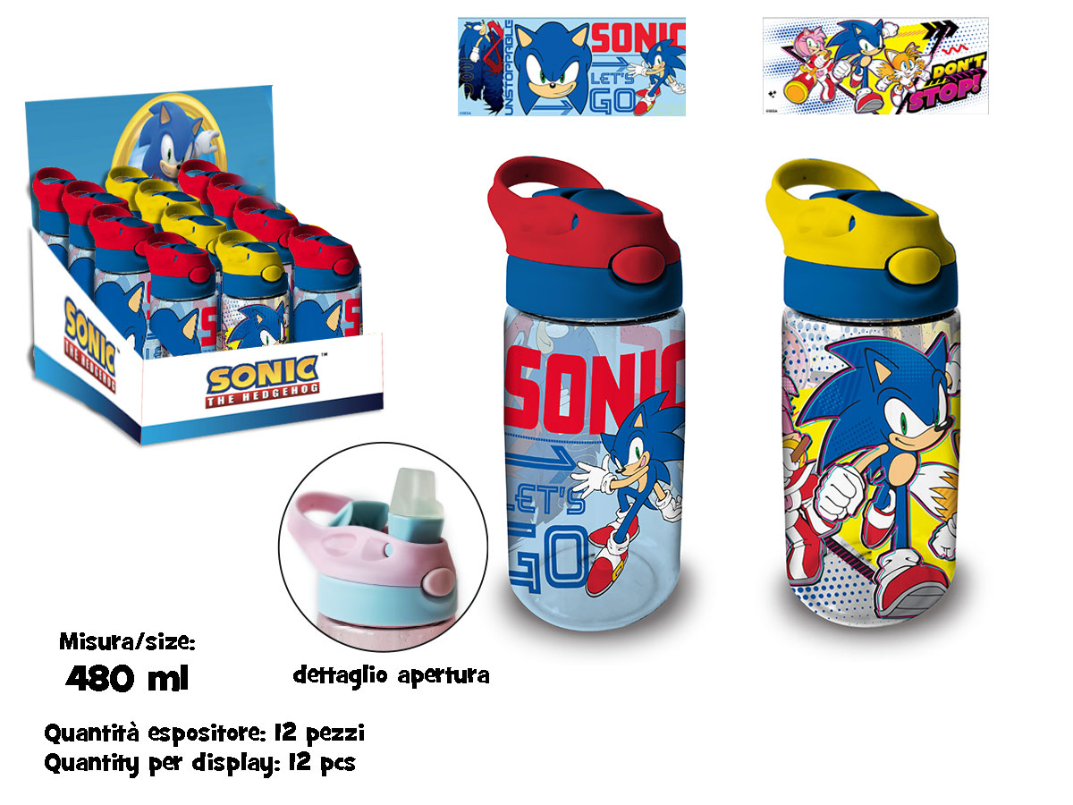 Borraccia trasparente 500 ml Sonic in plastica Biobased SK, materiale eco-sostenibile e senza BPA. Con cannuccia morbida, leggera e sicura per i bambini. Licenza ufficiale Sonic garantita.